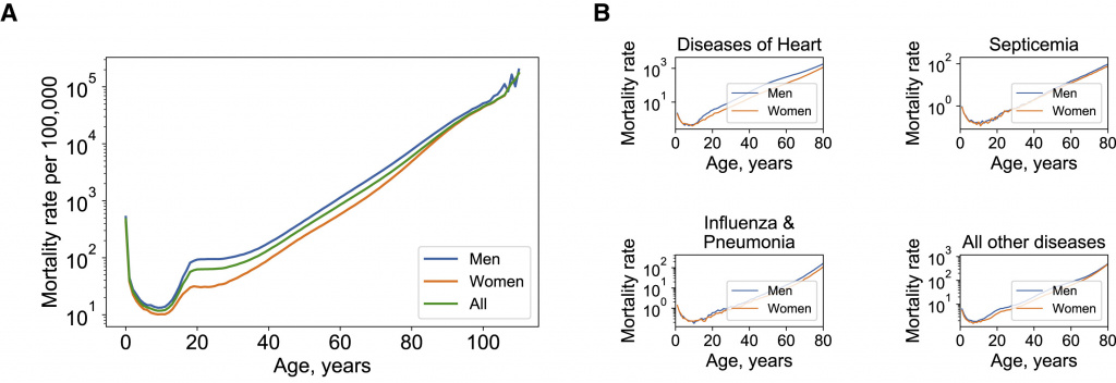 Группа ученых под руководством геронтолога Вадима Гладышева (Vadim Gladyshev) из Гарвардской медицинской школы собрала данные о смертности людей в разном возрасте, чтобы разобраться в том, откуда берется провал на кривой Гомперца. Сначала исследователи построили график смертности от всех причин в 19 странах с 1999 по 2015 годы. Там, как и следовало ожидать, они обнаружили провал в районе 9 лет.